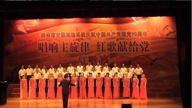 四是組織參加桂林市交通運輸系統“唱響主旋律,紅歌獻給黨”紅歌賽、代表桂林市交通系統參加桂林市直機關“九十華誕風雨路,最美桂林展新姿”歌詠比賽,歌頌在黨的領導下,中國革命、建設、發展取得的巨大成就,頌揚偉大祖國的繁榮昌盛,用歌聲向中國共産黨建黨90周年獻上最誠摯的祝福